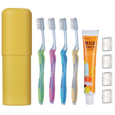 | 기타사항 | (종이케이스별도 100원) •구성 : 케이스(슬립형)+ 칫솔4개 + 페리오치약50g+ 캡4개 •Size : 최소 : 65 x 45 x 150mm / 최대 : 65 x 45 x 210mm •재질 : 케이스-HDPE / 칫솔-PP ※칼라인쇄시 100원 추가 |