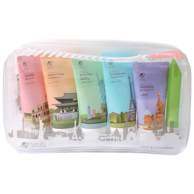 •샴푸 50ml, 컨디셔너 50ml,클렌징폼 30g, 바디워시 50ml,페리오 치약 50g, 여행용칫솔