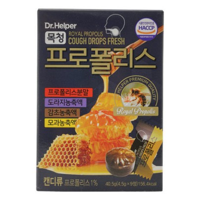 | 기타사항 | •40.5g(4.5g×10정), 156.4㎉ •사이즈 : 약70(W)×102(D)×23(H)㎜ •프로폴리스 분말, 도라지/감초/모과 농축 |